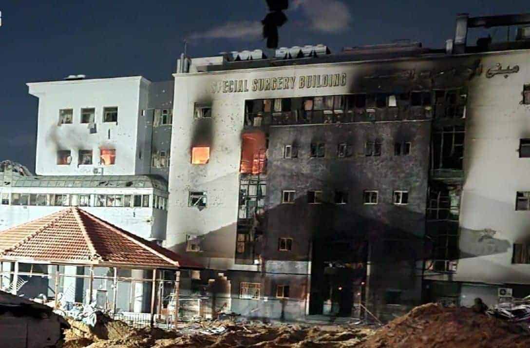 مشهد لمجمع الشفاء الطبي في غزة حيث يتعرض لهجوم هو الثاني منذ بدء الحرب على القطاع