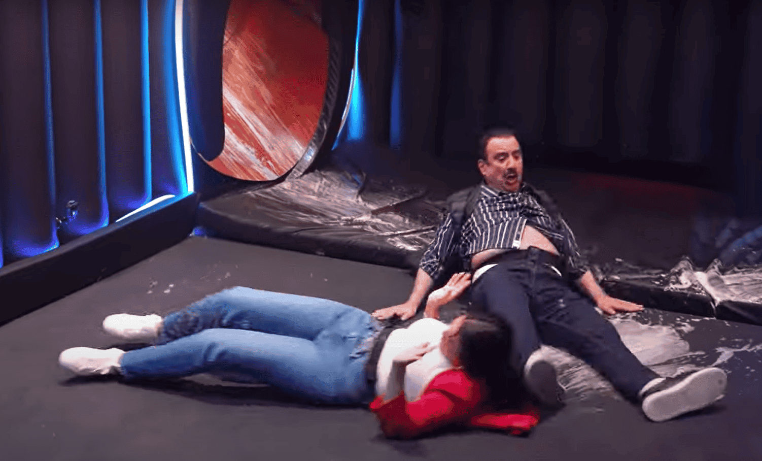 وفي الفقرة الأولى من البرنامج ـ رامز جاب من الآخر ـ وداخل ما يصفها رامز بالغرفة السوداء، اصطدمت قدم حسن عسيري برأس أصايل محمد، بعد خروجهما منزلقين من النفق.