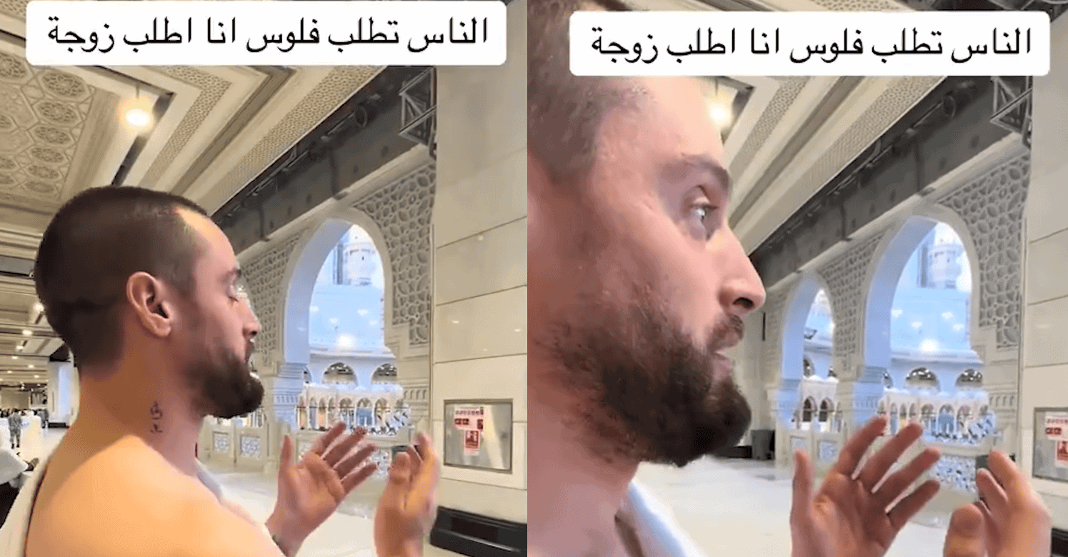 وكان آخر تلك المقاطع رجل بدا أنه أجنبي ويضع وشماً على رقبته ويرفع يديه ليطلب بالإنكليزية والعربية الزواج مضيفاً كلمة “بليز” في دعائه وعلق ناشر المقطع عليه: “الناس تطلب فلوس وأنا أطلب زوجة”.