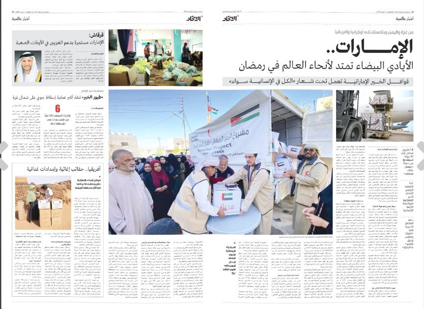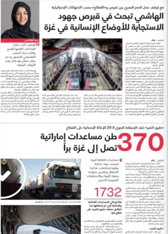 ورغم ذلك، فقد أفردت الصحيفة ثلاث صفحات من عدد الخميس، للحديث عن الجهود الإماراتية في قطاع غزة، وعن أدوار أبو ظبي “الداعمة للشعب الفلسطيني”، بحسب ما نشرت.
