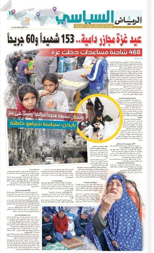 صحيفة “الرياض” أفردت صفحة كاملة لمجازر الاحتلال الإسرائيلي في قطاع غزة يوم العيد، وتحدثت عن الوضع الإنساني الصعب الذي يعانيه سكان القطاع.