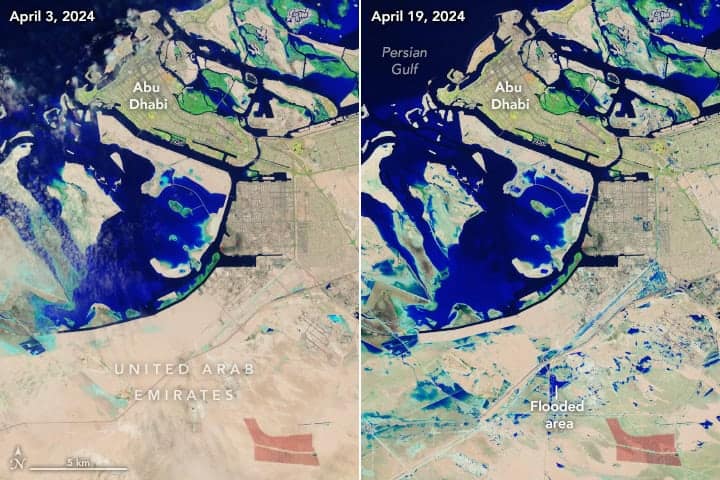 كما غمرت العواصف أجزاء من أبوظبي، عاصمة الإمارات. وتظهر صور “لاندسات 9” المدينة والمنطقة المحيطة بها في 3 أبريل و 19 أبريل، قبل وبعد العواصف.