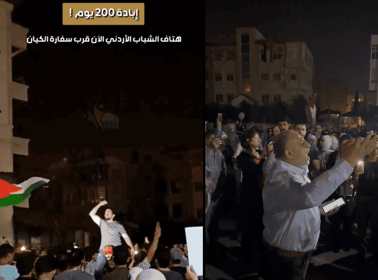 ووثق أحد المقاطع المتداولة تظاهرة حاشدة للأردنيين أمام سفارة الكيان المحتل، والتي شهدت عدة هتافات حماسية ضد الاحتلال ودعما لغزة، كما شملت الهتافات ردا على رسالة أبو عبيدة للأردنيين.