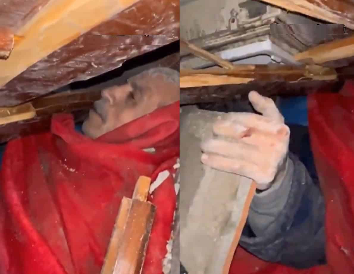وعلق المنقذ “عبود المجدلاوي ” على حسابه في موقع”إكس”تويتر :” أثناء قيامي بإنقاذ هذا الرجل العظيم ، وعند وصولي وجدته يصلي صلاة الفجر وهو على حالته هذه وفوقه أطنان من الحجارة “.