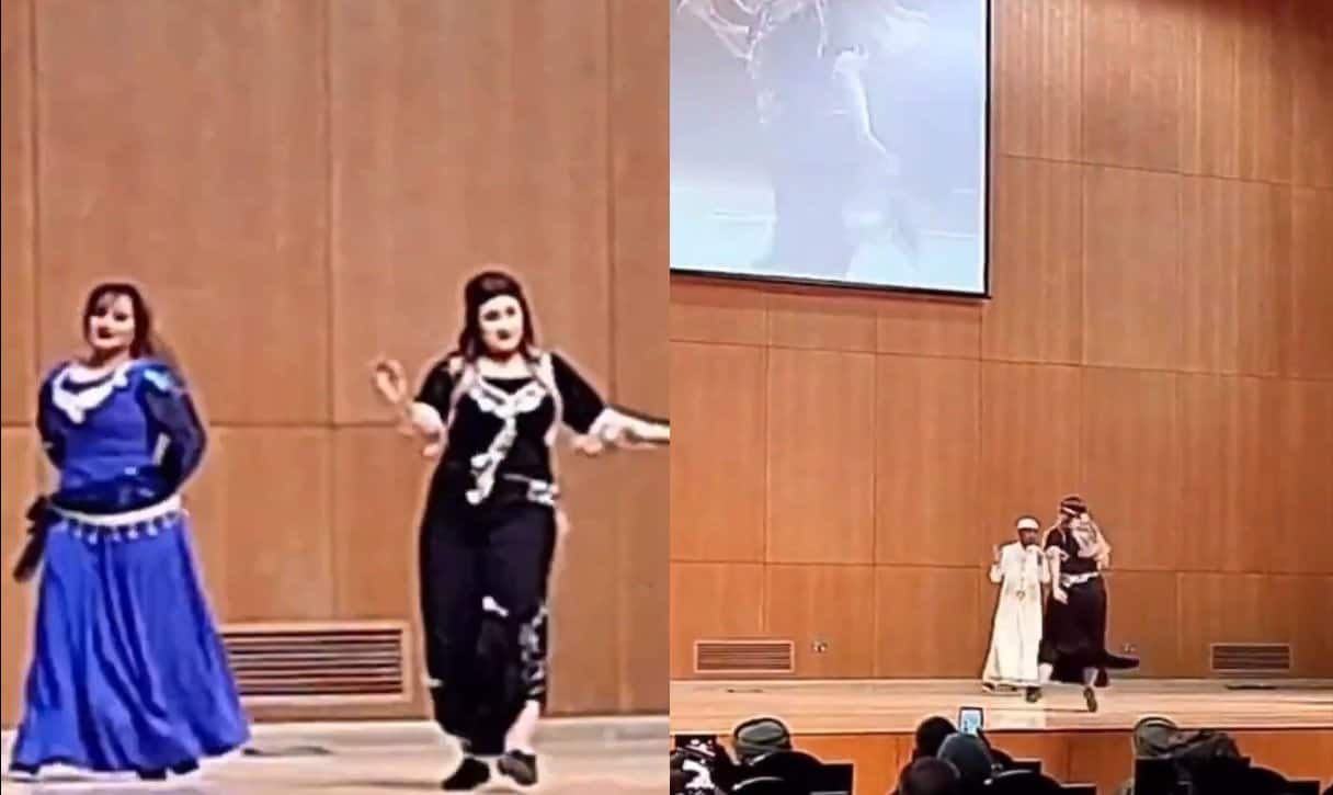 وأظهرت المشاهد المتداولة فتاتين ترتديان جلابيتين وهما ترقصان المعلاية بحماس على خشبة المسرح أمام الجمهور. فيما شوهد شخصان وهما يصفقان لهما ويشجعانهما.