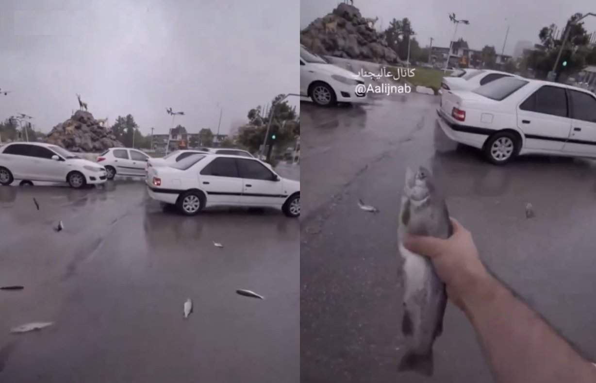 وأظهر مقطع فيديو وثقه إيرانيون، وتم تداوله على نطاق واسع على مواقع التواصل الاجتماعي، سقوط عشرات الأسماك على طريق يشهد حركة سير داخل المدينة.