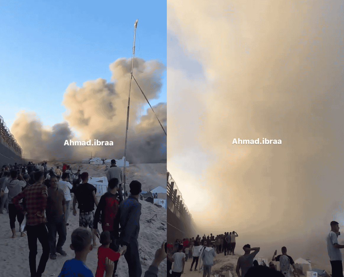 وأظهر مقطع الفيديو المتداول العشرات من الفلسطينيين خلف الجدار الاسمنتي الفاصل بين مصر وغزة بجانب خيام، فيما يشاهد في الخلفية دخان أبيض كثيف وفي مشهد تال يبدو النازحون وهم يحاولون تحاشي الدخان الذي غطى المكان.