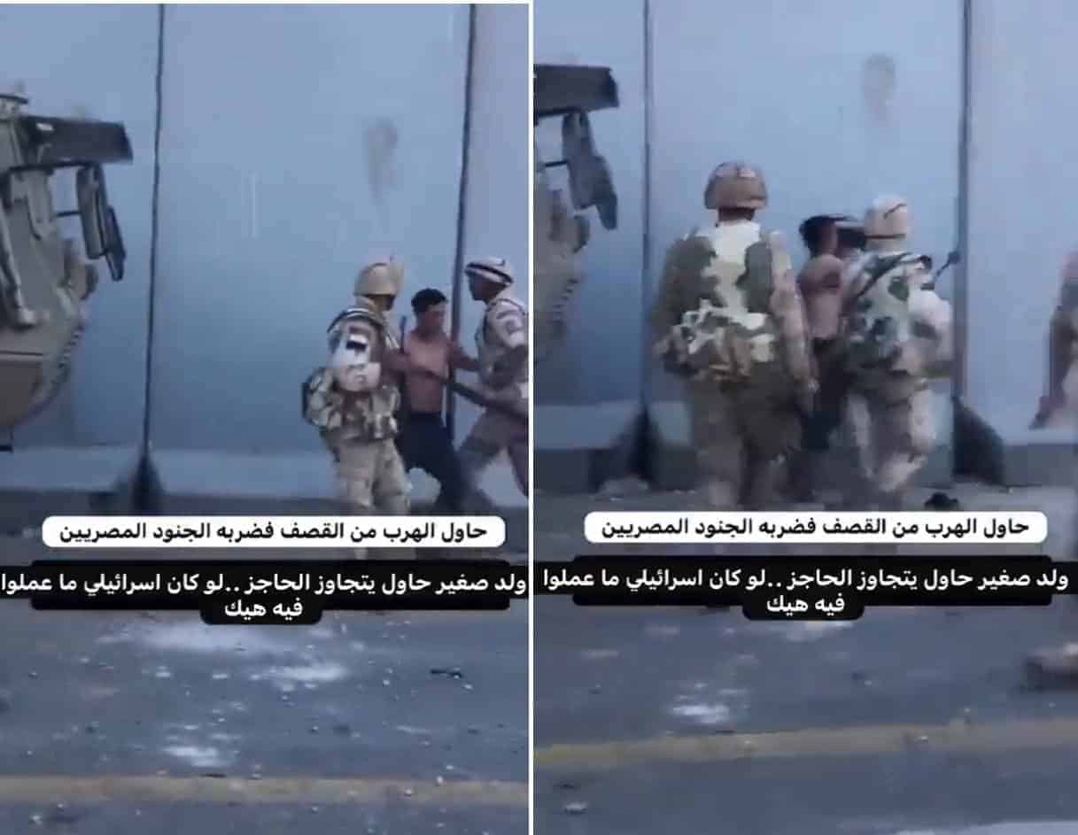 وأظهر الفيديو، الذي لم يتسنَ لـ”وطن” التأكد من حقيقته، الجنود المصريين وهم يعتدون بوحشية على الطفل الفلسطيني، فيما سُمعت أصوات تطالب بترك الطفل والتوقف عن الاعتداء عليه.