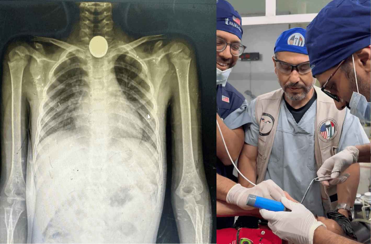 وكشف الطبيب الشجاع الذي يملك مشفى الشموسي الطبي التخصصي في سلطنة عمان، أن أحد الأطفال ويبلغ من العمر 8 سنوات ابتلع قطعة معدنية وانحشرت في المريء وعرض مع تغريدته صورة شعاعية لصدر الطفل المتأذي.