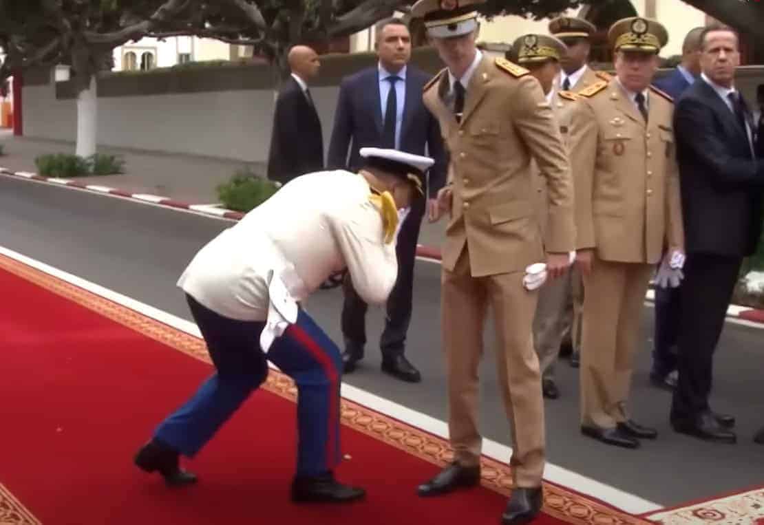 لكنّ طريقة سلام المسؤولين المغاربة على ولي العهد، أثارت جدلاً بين المغردين، متسائلين: “كيف يركع ضابط برتبة عليا وسامية كفريق أول ليقبّل يدى فتى، حتى لو كان هذا الفتى ولياً للعهد”.