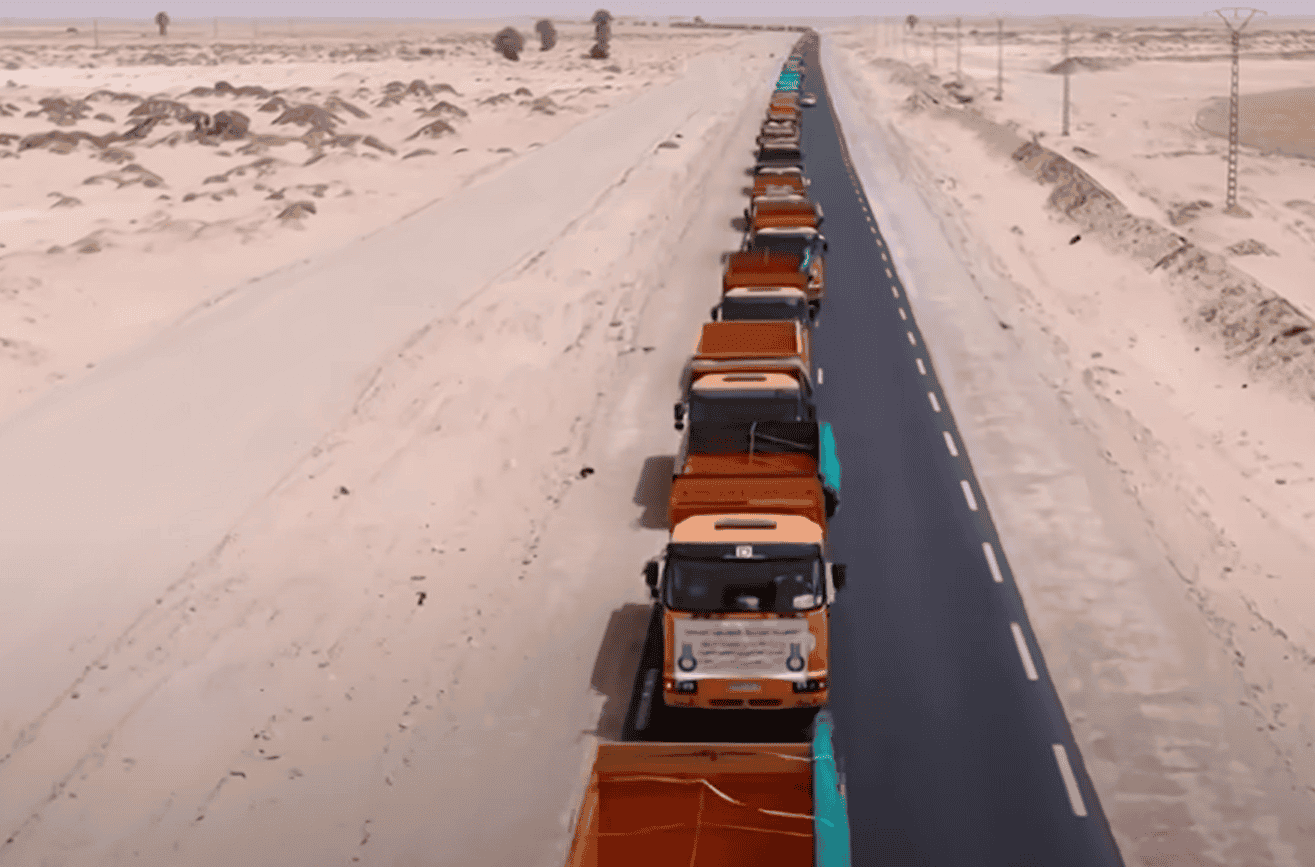 ويظهر المقطع مشاهد التقطت من الجو لعشرات الشاحنات مصطفة خلف بعضها البعض، في طريق بدا محفوفاُ بالأشجار الصحراوية، وادعى البعض أن المقطع مفبرك وليس حقيقيا.