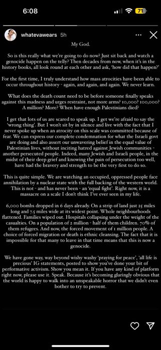 وجاء في الرسالة التي كتبتها شخصية باسم “إيفا” على إنستغرام، وأعادت نشرها ماريا: “هل هذا حقا ما سنفعله الآن؟ نجلس ونشاهد مجزرة تقع على أجهزة التلفاز؟ .ما العدد الذي يجب أن يصل إليه عدد القتلى في فلسطين كي نرفع أصواتنا؟ 10 آلاف؟ 100 ألف؟ مليون؟”.