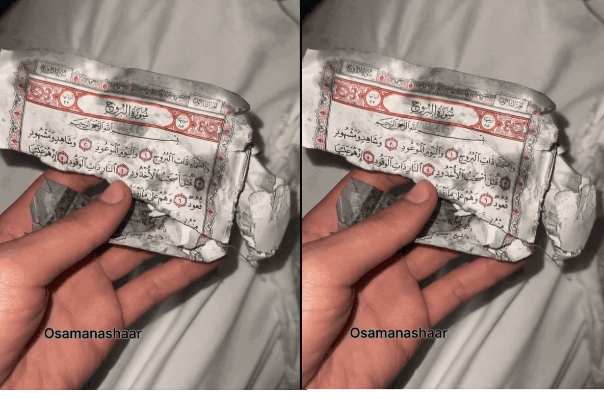 وطن – عثر عناصر الإنقاذ والدفاع المدني في جيب امرأة ارتقت شهيدة في مجزرة رفح، على مصحف صغير احتوى بعد أن طاله الحريق على آيتين كريمتين من سورة البروج، تعبران عن واقع حال أهالي قطاع غزة وهما (قتل أصحاب الأخدود، النار ذات الوقود).