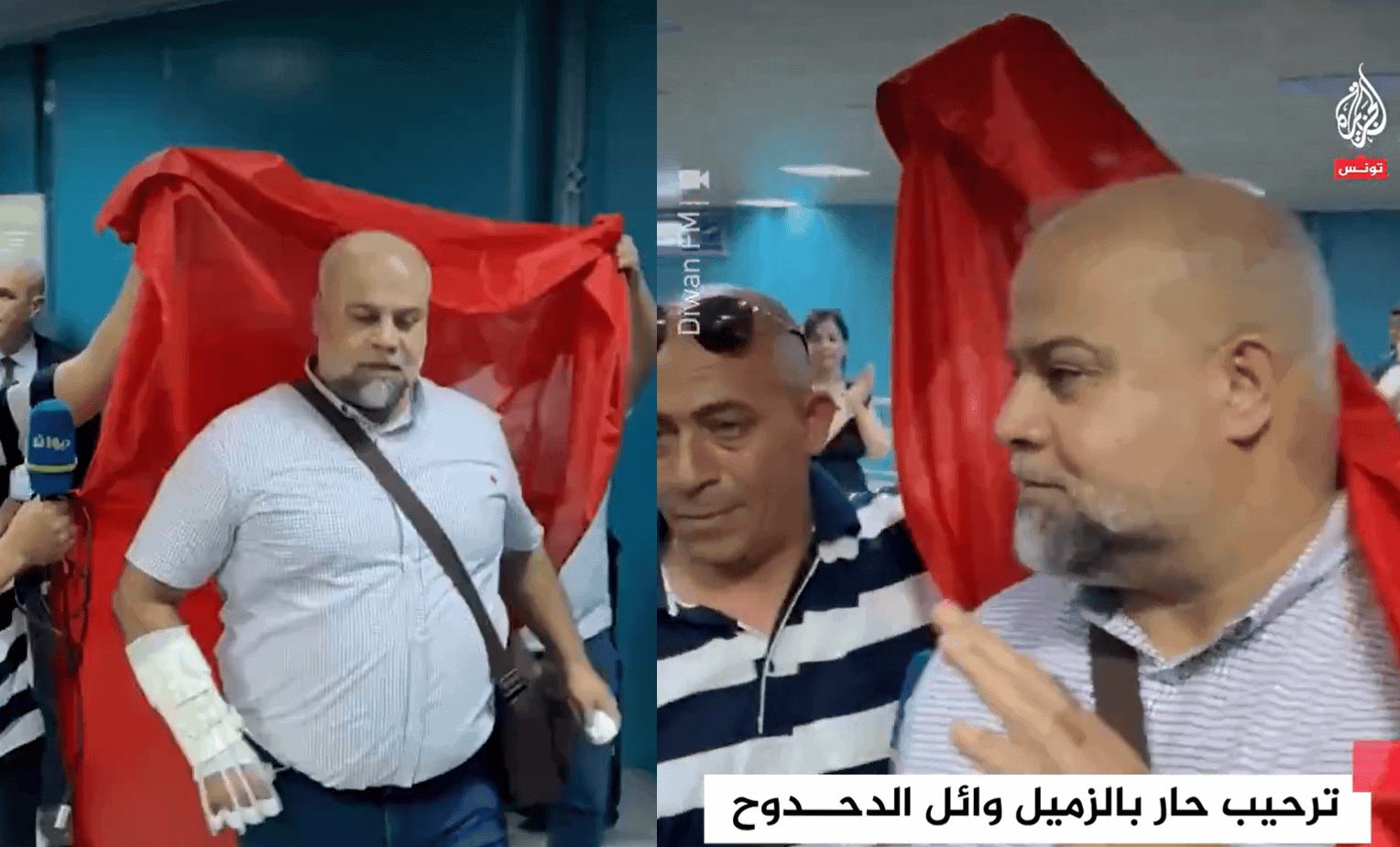 ووصل “الدحدوح” إلى المطار وسط تصفيق حار من التونسيين الذين بدوا وهم يرددون شعارات مرحبة به ومنها “بالروح بالدم نفديكي فلسطين”.