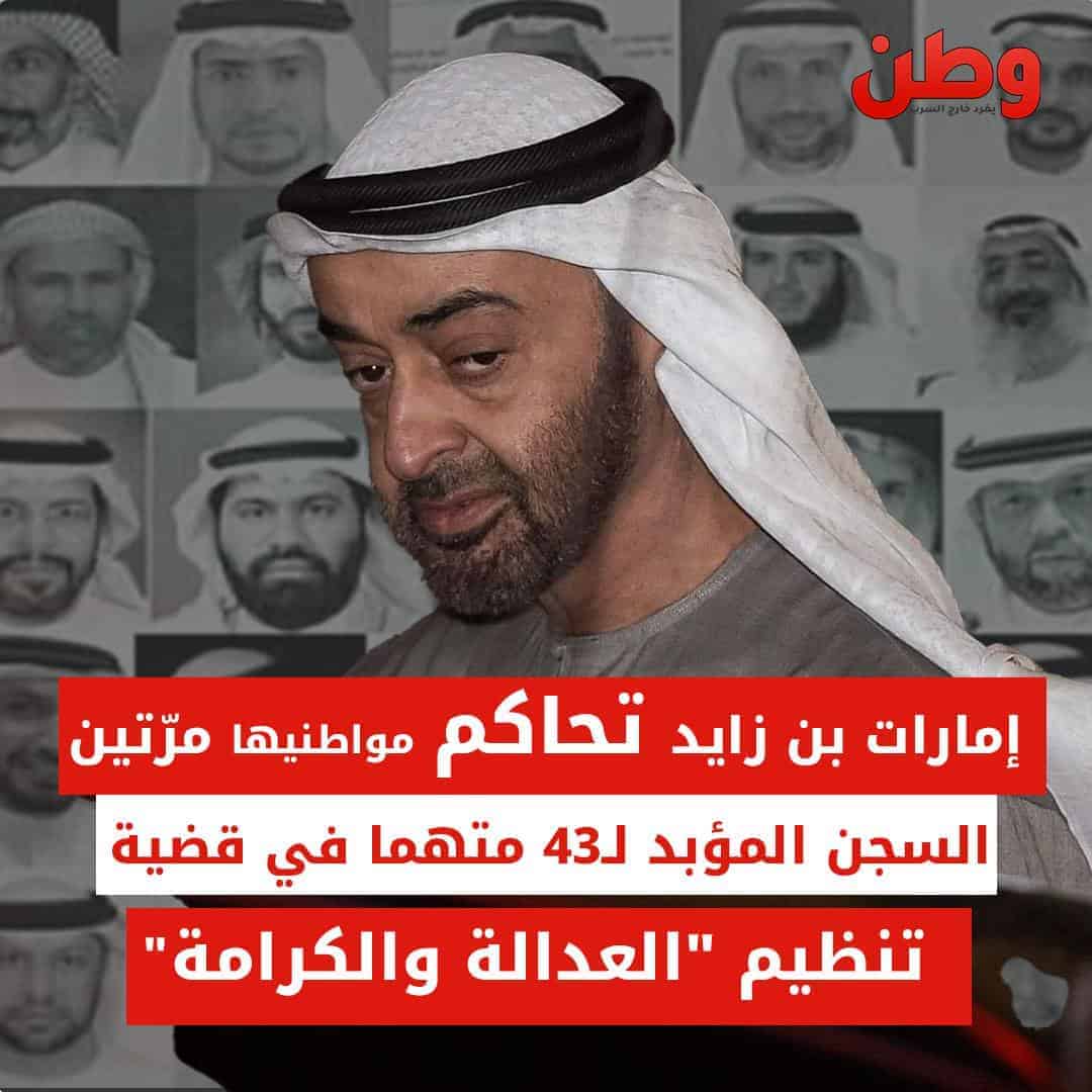 وطن – في محاكمة غير عادلة وبتكتم كبير، أصدرت الإمارات أحكاماً بالسجن المؤبد على 43 مواطناً بتهمة ارتكاب أعمال “إرهابية” في ما يعرف بقضية “الإمارات 84”.