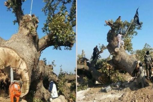 وطن _ جهاديون في سوريا يقطعون شجرة بلوط يزيد عمرها عن 150 سنة بعد ان اتهموا سكان المنطقة “بعبادتها من دون الله.” ووفق (بي بي سي) …