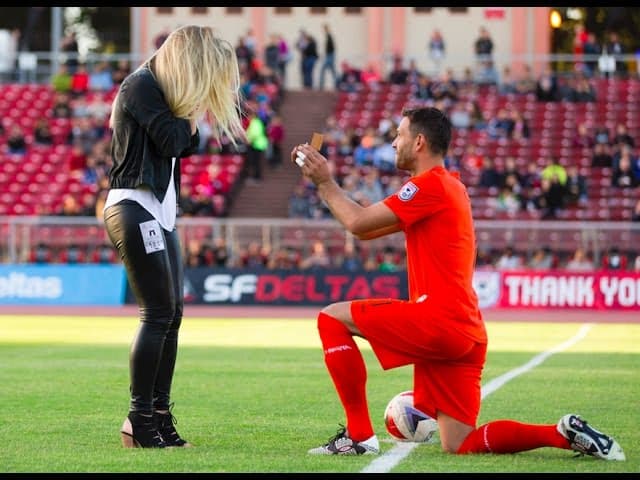أظهر مقطع فيديو نشر على موقع يوتيوب الإلكتروني، لحظة قيام لاعب كرة قدم بطلب الزواج من حبيبته على خط المنتصف لملعب كرة القدم قبيل بدء المباراة.…